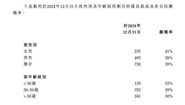 值得注意的是,截至2024年12月31日,新琪安的员工人数总计为728人,其中男员工493人,女员工235人,男女员工对应的离职率分别高达38%和41%,总离职率达到了39%。