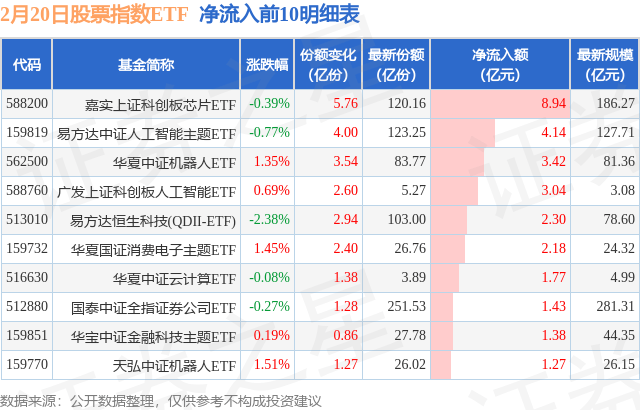 当日有207只股票指数ETF基金出现资金净流入,其中净流入排首位的是嘉实上证科创板芯片ETF(588200),份额增加了5.76亿份,净流入额为8.94亿元。