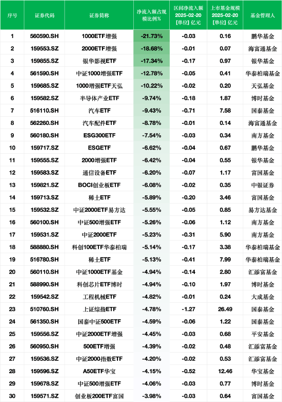 Wind数据显示,2月20日,鹏华1000ETF增强遭净赎回0.03亿元,当日资金净流出额占规模比例为21.73%。