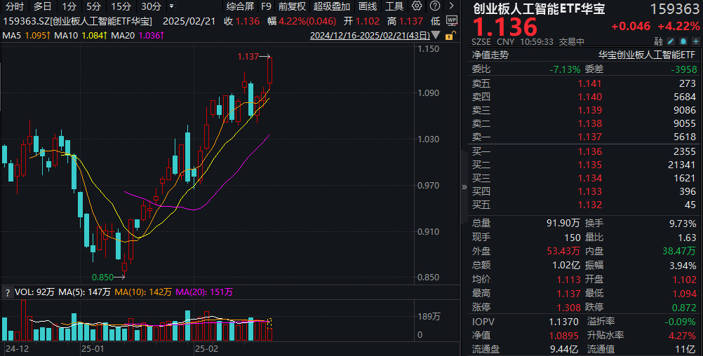 热门ETF方面,全市场首只的创业板人工智能ETF华宝(159363)盘中单边走高,场内价格上涨4.31%创新高,场内实时涨幅领跑全市场AI主题类ETF,冲击日线三连阳,实时成交额快速超1亿元,交投高度活跃。