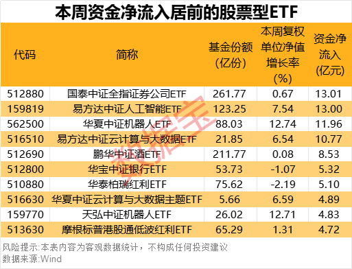 本周7只股票型ETF均有超5亿元资金净流入,从资金净买入的方向来看,集中在AI、机器人、云计算、数据中心等科技方向,白酒、银行、电力、煤炭等红利板块也有资金布局。