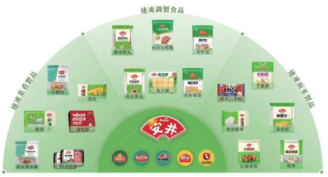 其预制菜主力“洪湖诱惑”、“柳伍”为收购品牌,均主营小龙虾产品;旗舰品牌“安井”推出虾滑、蛋饺等即烹食材;自有子品牌“冻品先生”聚焦酸菜鱼、藕盒等;“安井小厨”则主推小酥肉、荷香糯米鸡等。