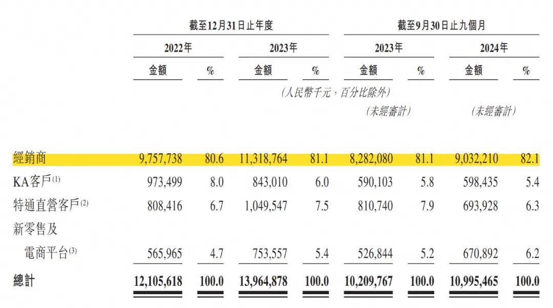 其中经销商一直都是绝对的主力,2022年、2023年以及2024年三季度,他们贡献的收入分别为97.6亿元、113.2亿元和90.3亿元,占总收入的比例均超过八成。截至去年四季度,安井的经销商总数为2069个。据弗若斯特沙利文,2023年,每名经销商平均贡献收入约580万元,超过行业头部公司水平。