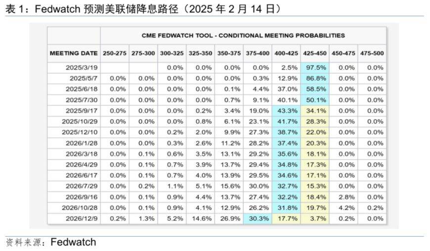 1月特朗普上台后,宣布了多项关税政策,但频繁、多变,政策不确定性高悬。同时,其要压低美债长端利率,但推动的政策又偏向于推升通胀,使得市场索要更高的通胀风险补偿。在今年美国通胀和劳动力市场情况相对更为复杂,以及特朗普政策给去通胀带来更多不确定性的背景下,受1月美国通胀升温影响,降息预期继续回撤,首次降息时点推已迟至9月。