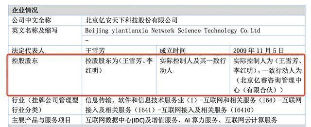 亿安天下的实际控制人为王雪芳、 李红明,一致行动人为北京亿睿咨询管理中心(有限合伙)),而王雪芳与李红明系夫妻关系。