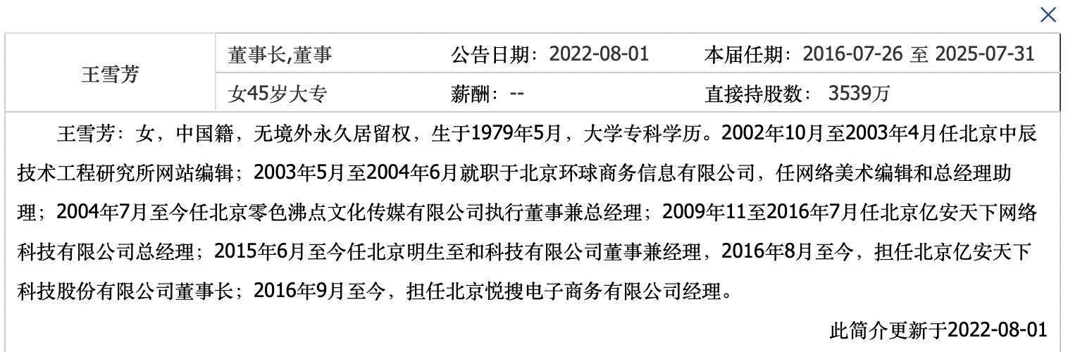 资料显示,王雪芳,女,中国籍,无境外永久居留权,生于1979年5月,大学专科学历。其于2002年10月至2003年4月任北京中辰技术工程研究所网站编辑;2003年5月至2004年6月就职于北京环球商务信息有限公司,任网络美术编辑和总经理助理;2004年7月至今任北京零色沸点文化传媒有限公司执行董事兼总经理;2009年11至2016年7月任北京亿安天下网络科技有限公司总经理;2015年6月至今任北京明生至和科技有限公司董事兼经理,2016年8月至今,担任北京亿安天下科技股份有限公司董事长;2016年9月至今,担任北京悦搜电子商务有限公司经理。