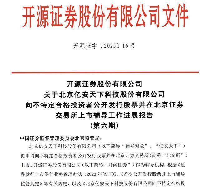 瑞财经 吴文婷近日,北京亿安天下科技股份有限公司(以下简称“亿安天下”)披露北交所IPO辅导工作进展报告(第六期),辅导机构为开源证券股份有限公司。