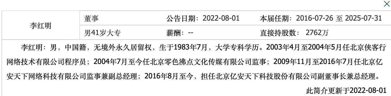 李红明,男,中国籍,无境外永久居留权,生于1983年7月,大学专科学历。其于2003年4月至2004年5月任北京侠客行网络技术有限公司程序员;2004年7月至今任北京零色沸点文化传媒有限公司监事;2009年11月至2016年7月任北京亿安天下网络科技有限公司监事兼副总经理;2016年8月至今,担任北京亿安天下科技股份有限公司副董事长兼总经理。