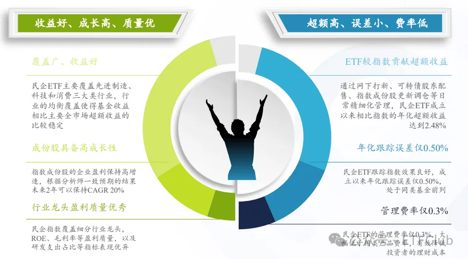 1、民企ETF覆盖全市场主要行业,民营经济属性提供独特的α价值:民企ETF主要覆盖现金制造、科技和消费三大类行业,行业的均衡覆盖使得基金收益相比主要全市场超额收益比较稳定。