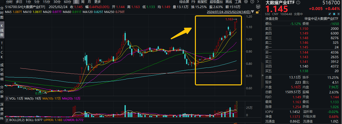 风险提示:大数据产业ETF(516700)被动跟踪中证大数据产业指数,该指数基日为2012.12.31,发布于2016.10.18,该指数近5年分年度涨跌幅为:2020年,3.57%;2021年,-3.5%;2022年,-25.68%;2023年,1.4%;2024年,10.57%,指数成份股构成根据该指数编制规则适时调整,其回测历史业绩不预示指数未来表现。本文中提及的指数成份股仅作展示,个股描述不作为任何形式的投资建议,也不代表管理人旗下任何基金的持仓信息和交易动向。基金管理人评估的该基金风险等级为R3-中风险,适宜平衡型(C3)及以上的投资者,适当性匹配意见请以销售机构为准。任何在本文出现的信息(包括但不限于个股、评论、预测、图表、指标、理论、任何形式的表述等)均只作为参考,投资人须对任何自主决定的投资行为负责。另,本文中的任何观点、分析及预测不构成对阅读者任何形式的投资建议,亦不对因使用本文内容所引发的直接或间接损失负任何责任。基金投资有风险,基金的过往业绩并不代表其未来表现,基金管理人管理的其他基金的业绩并不构成基金业绩表现的保证,基金投资须谨慎。