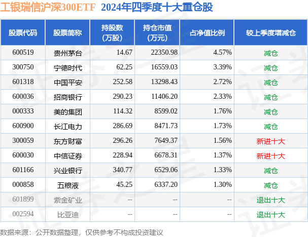 工银瑞信沪深300ETF为指数型-股票基金,根据最新一期基金季报显示,该基金资产配置:股票占净值比98.73%,无债券类资产,现金占净值比1.27%。基金十大重仓股如下: