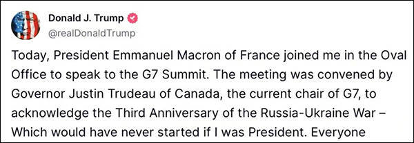 与马克龙会晤后,特朗普还在“真相社交”上发文朝七国集团(G7)主席国加拿大的总理特鲁多喊话,再次戏称他为“加拿大州长”,感谢特鲁多在俄乌冲突三周年之际组织了此次会晤,还不忘强调“如果我是总统,这一切都不会发生”。