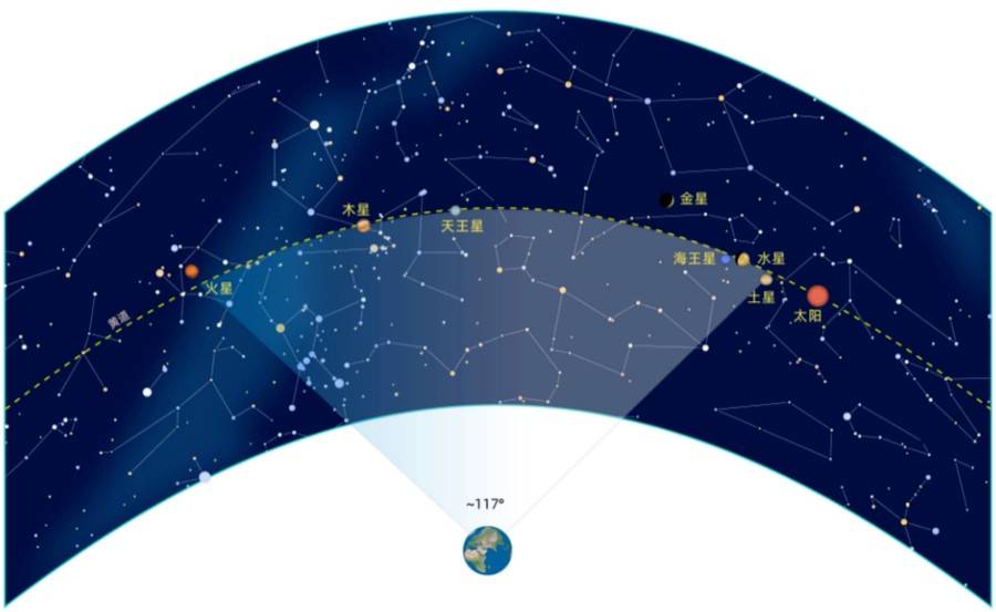 据上海天文台介绍,参与此次连珠的行星自西向东分别为土星、水星、海王星、金星、天王星、木星和火星,它们将出现在黄昏日落后不久。从最西端的土星到最东端的火星,张角为117°,横跨大半个天空。