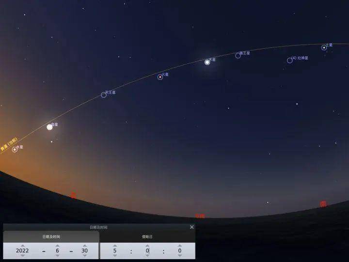 然而,由于金星更靠北一些,因此这个连珠串看着不是很完美。更重要的是,其中天王星和海王星因为亮度太低了,肉眼不可见。即便完全天黑,天王星的亮度也仅仅在理论上的目力极限边缘。