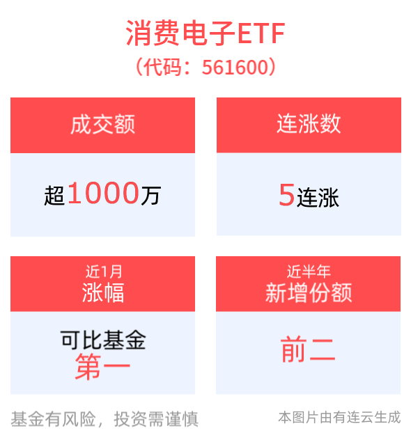 中证消费电子主题指数(931494)上涨0.77%,成分股环旭电子(601231)上涨6.74%,澜起科技(688008)上涨5.20%,光弘科技(300735)上涨4.78%,立讯精密(002475)上涨4.39%,寒武纪(688256)上涨4.21%。消费电子ETF(561600)上涨0.53%, 冲击5连涨。最新价报0.95元,半日成交额已达1631.90万元,暂居可比ETF1/5,换手率9.59%。