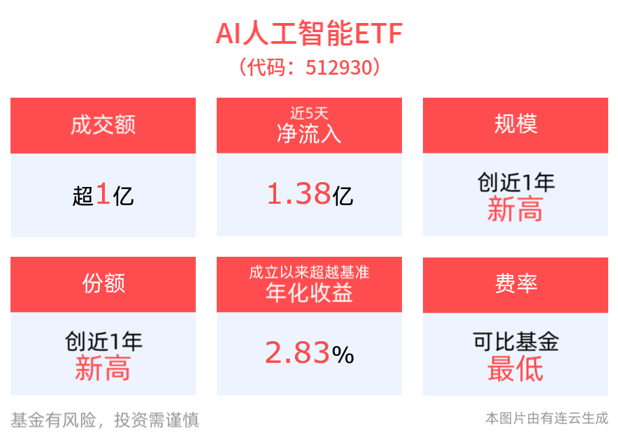规模方面,AI人工智能ETF最新规模达16.91亿元,创近1年新高。