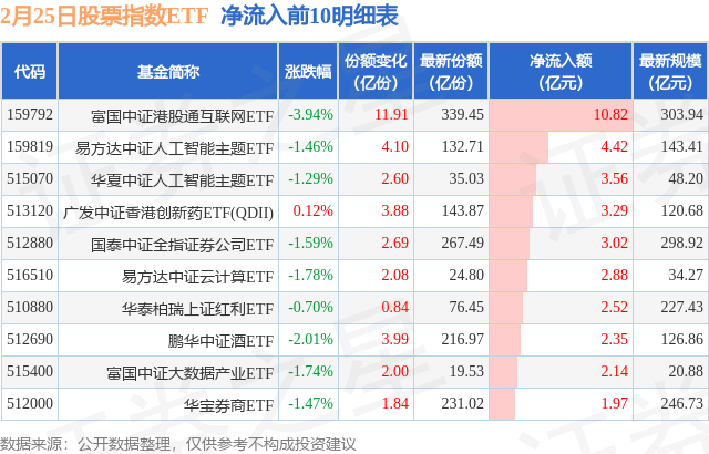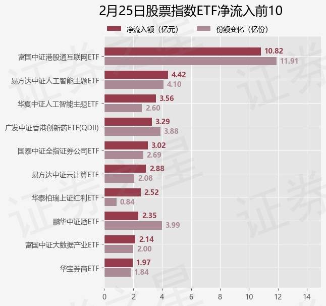 当日有248只股票指数ETF基金出现资金净流入,其中净流入排首位的是富国中证港股通互联网ETF(159792),份额增加了11.91亿份,净流入额为10.82亿元。