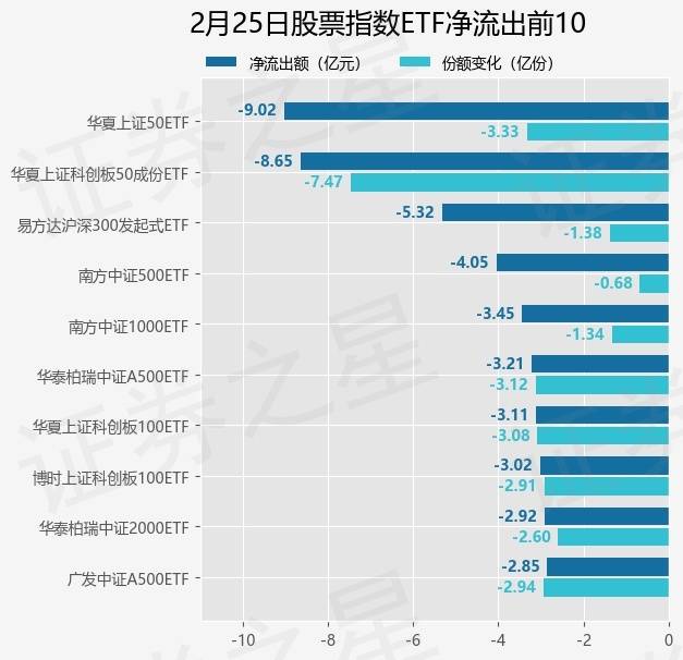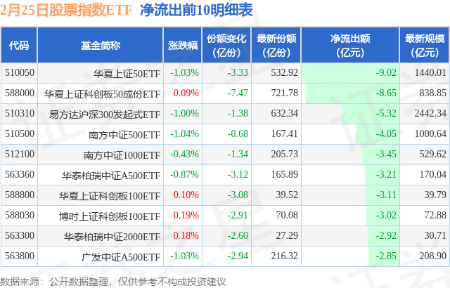 当日有289只股票指数ETF基金出现资金净流出,其中净流出排首位的是华夏上证50ETF(510050),份额减少了3.33亿份,净流出额为9.02亿元。