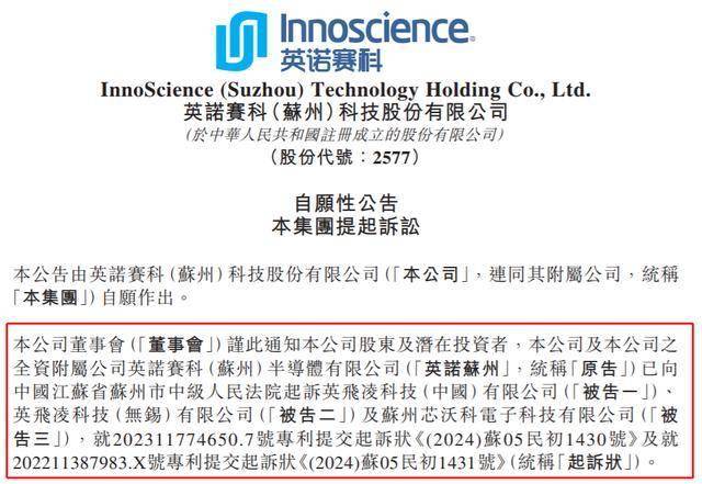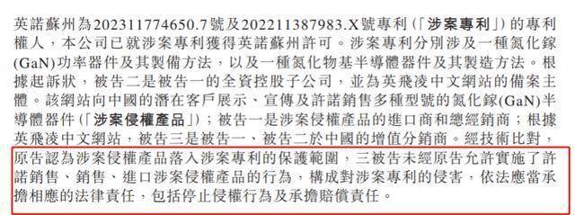 值得注意的是,在歌尔微递表港交所的同时,其主要供应商英飞凌正陷入一场专利诉讼。1月16日,英诺赛科公告称,公司及公司全资附属公司英诺赛科(苏州)半导体有限公司(统称原告)已向苏州市中级人民法院起诉英飞凌科技(中国)有限公司、英飞凌科技(无锡)有限公司及苏州芯沃科电子科技有限公司,就202311774650.7号专利、202211387983.X号专利提起诉讼。