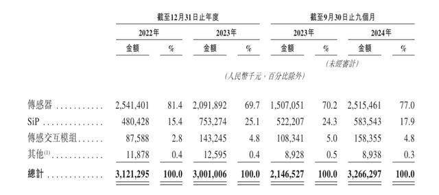 根据此次赴港IPO递交的招股书,歌尔微的主要收入来自于传感器,2022年、2023年及2024年1-9月,歌尔微来自于传感器的收入分别为25.41亿元、20.92亿元、25.15亿元,分别占各期总收入的81.4%、69.7%、77%。