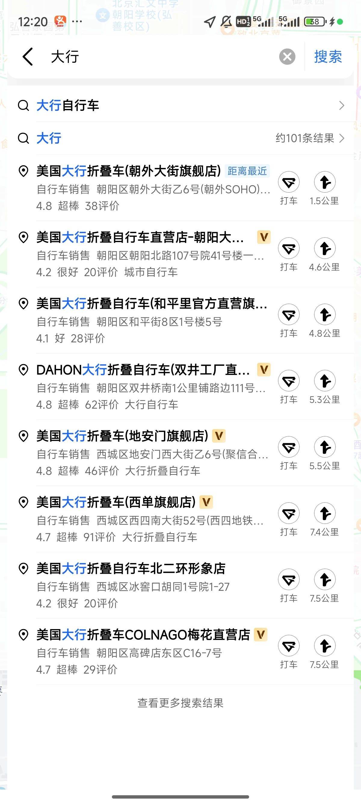 「探客出行」搜索发现,大行品牌的线下店铺名称在出行软件上均显示为“美国大行折叠自行车”字样,充分外显其“美国”属性。
