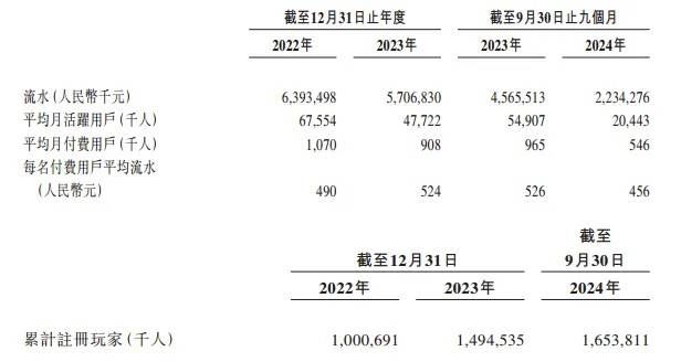 星邦互娱的累计注册玩家由2022年的10亿人增加至2023年的15亿人,再增加至2024年9月30日的16.5亿人。于2022年、2023年及截至2024年前九个月,公司游戏平均月活跃用户分别为6755.4万人、4772.2万人、2044.3万人,平均月付费用户107.0万人、90.8万人、54.6万人,每名付费用户平均流水分别为人民币490元、人民币524元及人民币456元。