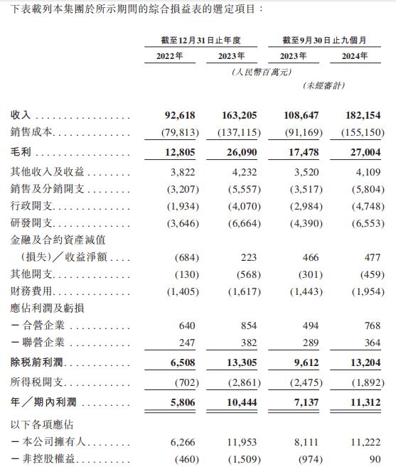 招股书显示,2022年到2023年,公司营收从926.18亿元显著增长至1632.05亿元,2024年前9个月,实现营收1821.54亿元,超过2023全年。同期公司净利润也同步提升,2022年、2023年净利润分别为58.06亿元、104.44亿元,同比增长近80%。2024年前9个月的净利润为113.12亿元。