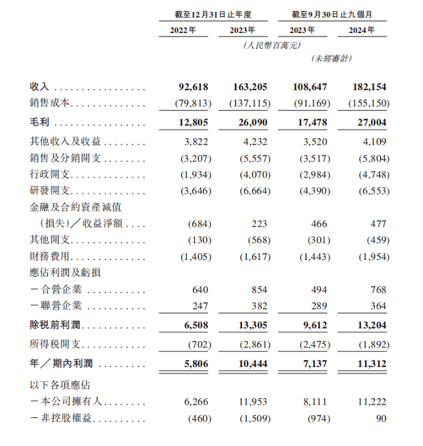 近三年业绩的增长尤其是海外业务的爆发,对奇瑞汽车赴港上市形成了有力支撑:2022年—2024年,奇瑞汽车年销量分别为123.3万辆、188.1万辆、260.39万辆。2022年、2023年、2024年1-9月,奇瑞汽车营业收入分别为926.18亿元、1632.05亿元、1821.54亿元人民币;其中,2024年1-9月,公司净利润为113.12亿元人民币,同比增长58.5%。