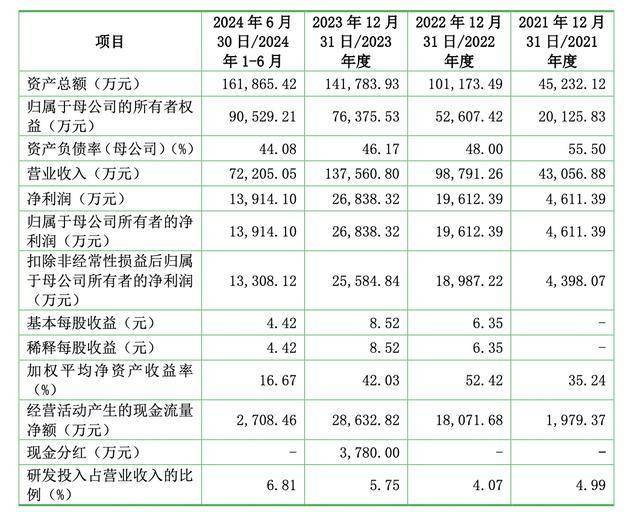 据招股书,2021年-2023年及2024上半年,优优绿能实现营业收入分别为4.31亿元、9.88亿元、13.76亿元、7.22亿元;归属于母公司所有者的净利润分别为4611.39万元、1.96亿元、2.68亿元、1.39亿元。
