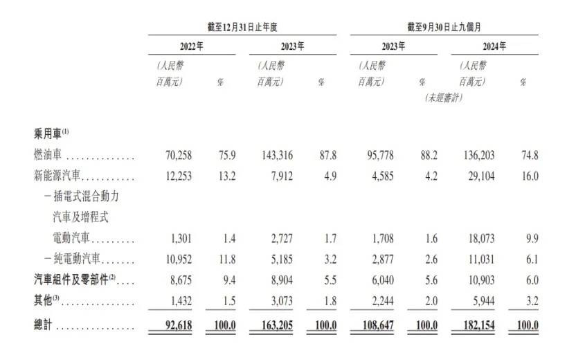 如果拆分一下奇瑞各个板块的经营情况,2022年-2024年9月,奇瑞燃油车收入分别为70.26亿元、143.32亿元和136.20亿元,占营收比分别为75.9%、85.8%和74.8%;而来自新能源汽车的收入分别为122.53亿元、79.12亿元和291.04亿元,所占总收入比例为13.2%、4.9%以及16%。
