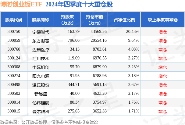 博时创业板ETF为指数型-股票基金,根据最新一期基金季报显示,该基金资产配置:股票占净值比99.21%,无债券类资产,现金占净值比0.83%。基金十大重仓股如下:
