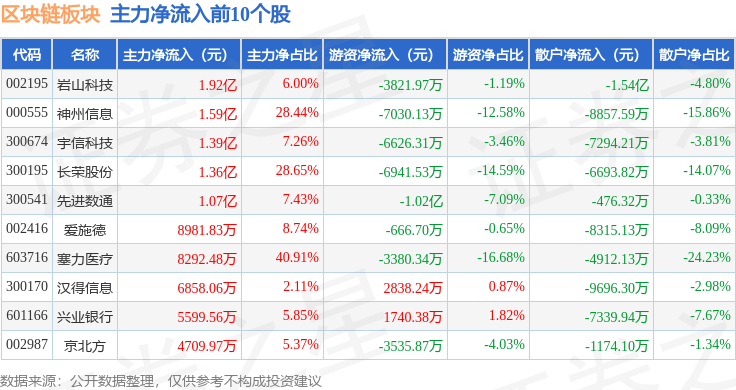 从资金流向上来看,当日区块链板块主力资金净流出53.94亿元,游资资金净流出5.64亿元,散户资金净流入59.58亿元。区块链板块个股资金流向见下表: