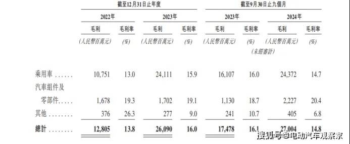 整体来看,奇瑞的毛利率来自于乘用车销售,分别占截至2022年及2023年12月31日止年度以及截至2023年及2024年9月30日止九个月毛利总额的84.0%、92.4%、92.2%及90.3%。
