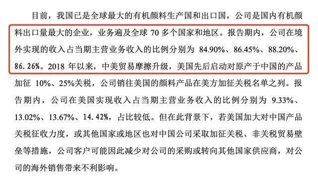 值得注意的是,报告期内,公司在境外实现的收入占当期主营业务收入的比例分别为84.90%、86.45%、88.20%、 86.26%。