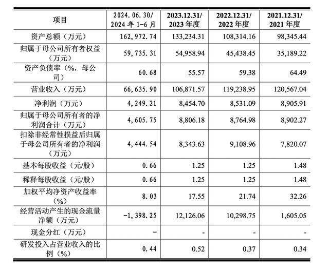 据招股书,2021年-2023年及2024上半年,信凯科技实现营业收入分别为12.06亿元、11.92亿元、10.69亿元、6.66亿元;归母净利润分别为8902.27万元、8764.98万元、8806.18万元、4605.75万元。