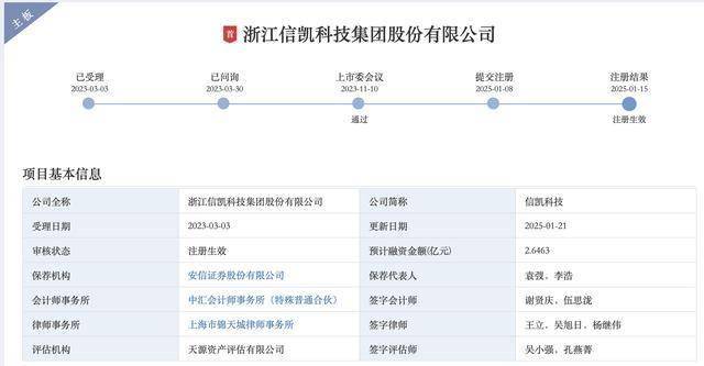 瑞财经 吴文婷近日,据深交所显示,浙江信凯科技集团股份有限公司(以下简称“信凯科技”)IPO注册生效,此时距离其提交注册仅过去7天,保荐机构为安信证券。