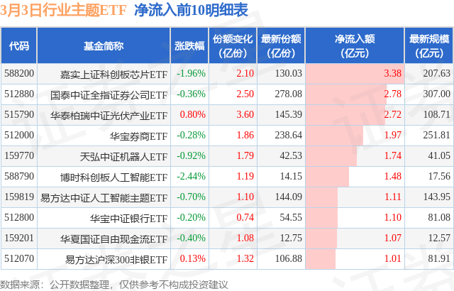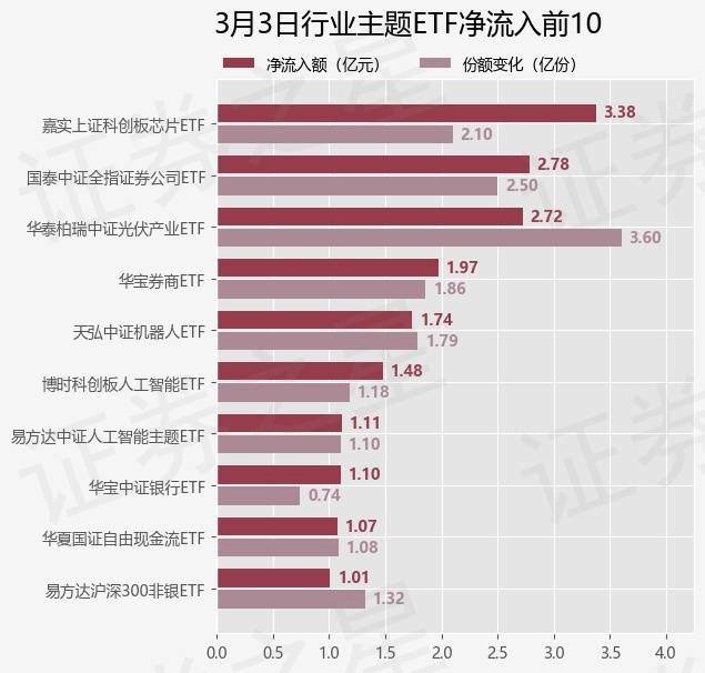 当日有147只行业主题ETF基金出现资金净流入,其中净流入排首位的是嘉实上证科创板芯片ETF(588200),份额增加了2.1亿份,净流入额为3.38亿元。
