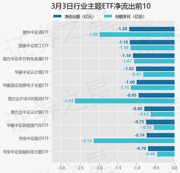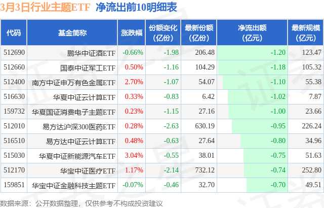 当日有167只行业主题ETF基金出现资金净流出,其中净流出排首位的是鹏华中证酒ETF(512690),份额减少了1.98亿份,净流出额为1.2亿元。