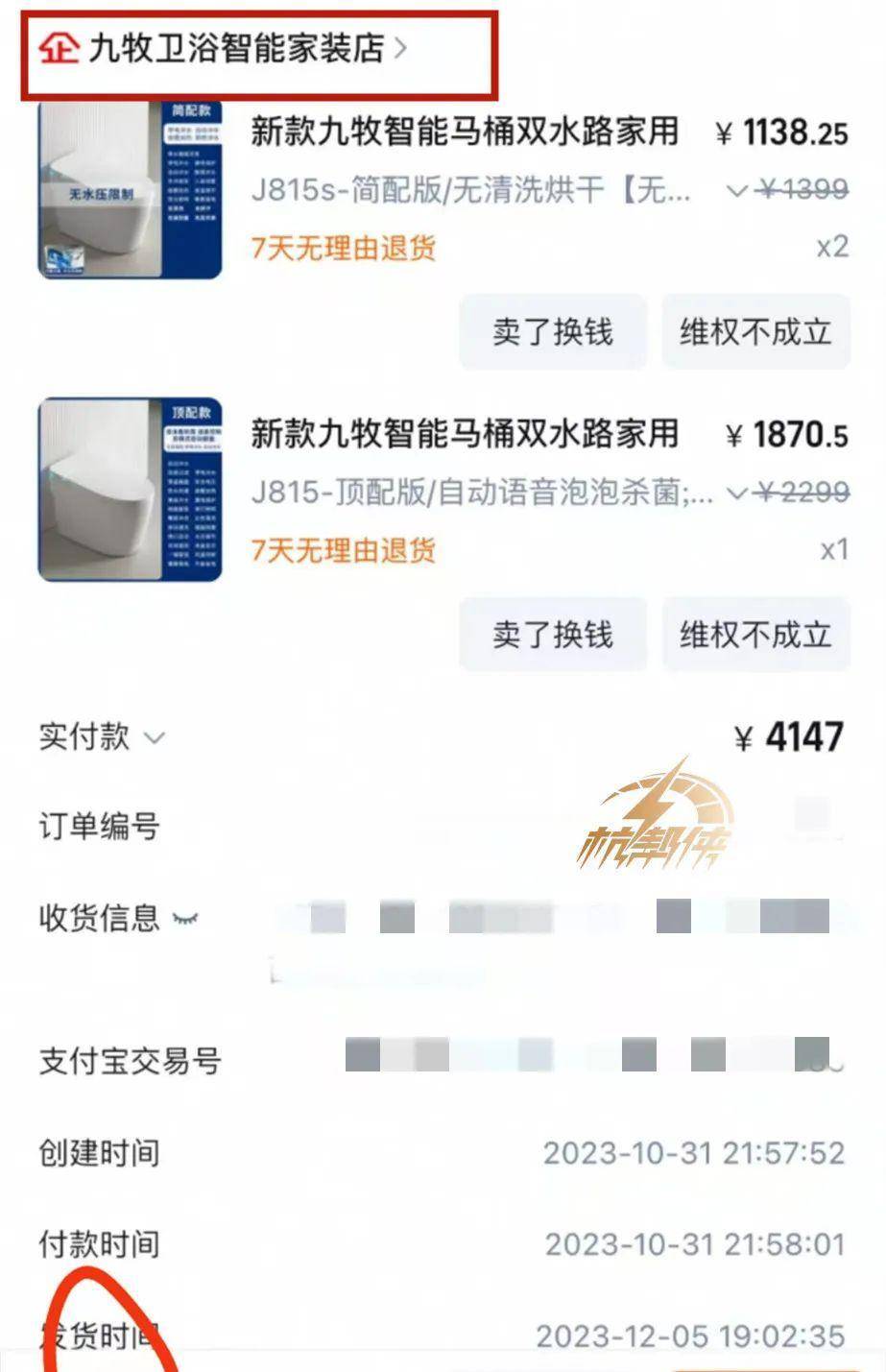 原来,郑先生2023年10月底新房装修时,在淘宝一家名为“九牧卫浴智能家装店”的店铺中购买了三个智能马桶,总计付费4147元。就在2025年2月23日,其中一个马桶出现故障需要维修时才得知:这并不是九牧官方的智能马桶,而是假货!