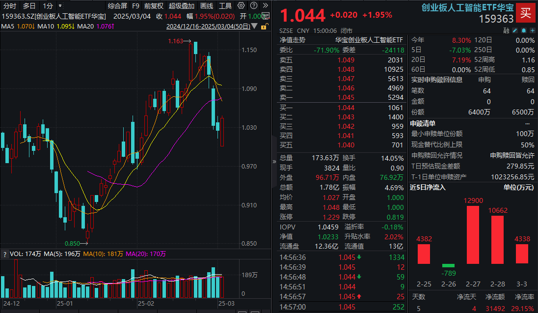 热门ETF方面,全市场首只的创业板人工智能ETF华宝(159363)午后持续走高,场内价格收涨1.95%,终结三连阴。场内交投活跃,全天换手率超14%,成交额达1.78亿元。资金此前频繁借道ETF布局创AI,创业板人工智能ETF华宝(159363)近五日累计吸金超3亿元!