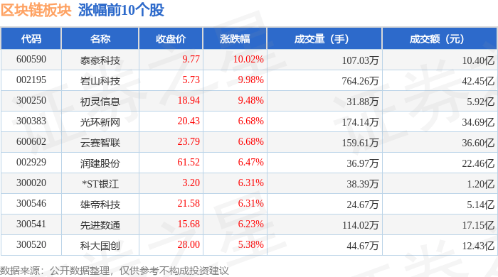 证券之星消息,3月5日区块链板块较上一交易日上涨0.86%,泰豪科技领涨。当日上证指数报收于3341.96,上涨0.53%。深证成指报收于10709.46,上涨0.28%。区块链板块个股涨跌见下表: