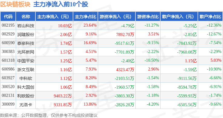 从资金流向上来看,当日区块链板块主力资金净流出22.06亿元,游资资金净流入2.45亿元,散户资金净流入19.61亿元。区块链板块个股资金流向见下表: