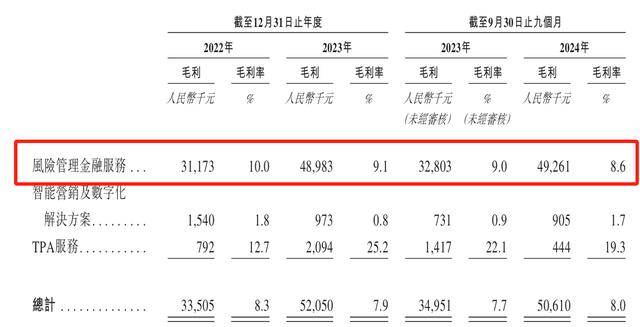 毛利率方面,报告期内,白鸽在线的毛利分别录得33.5百万元、52.1百万元、50.6百万元,相应的毛利率分别为8.3%、7.9%、8.0%。记者注意到,其第一大业务风险管理金融服务的毛利率在不断走低,由2022年的10%降至2024年前九月的8.6%。