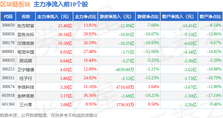 从资金流向上来看,当日区块链板块主力资金净流入131.49亿元,游资资金净流出58.12亿元,散户资金净流出73.37亿元。区块链板块个股资金流向见下表: