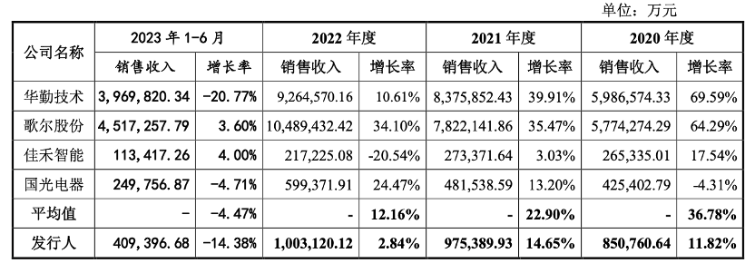 事实上,通力股份报告期内业绩表现同样不如同行业可比公司。2020年-2023年上半年,通力股份销售收入增长率分别为11.82%、14.65%、2.84%和-14.38%,而同行业可比公司平均值则分别为36.78%、22.90%、12.16%和-4.47%,均高于通力股份。