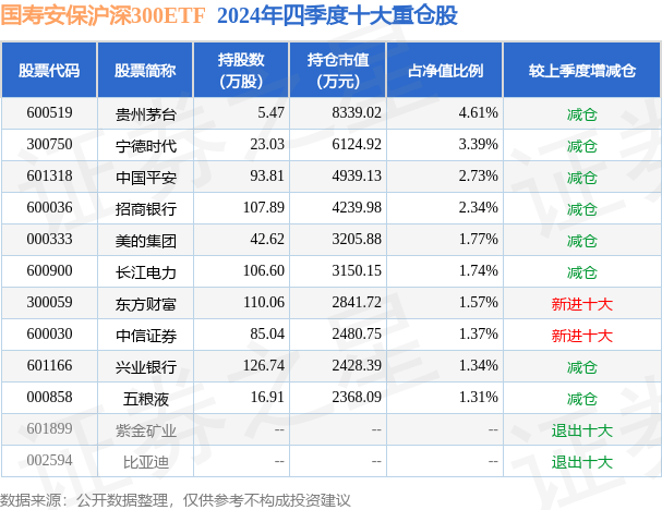 国寿安保沪深300ETF为指数型-股票基金,根据最新一期基金季报显示,该基金资产配置:股票占净值比99.41%,无债券类资产,现金占净值比0.69%。基金十大重仓股如下: