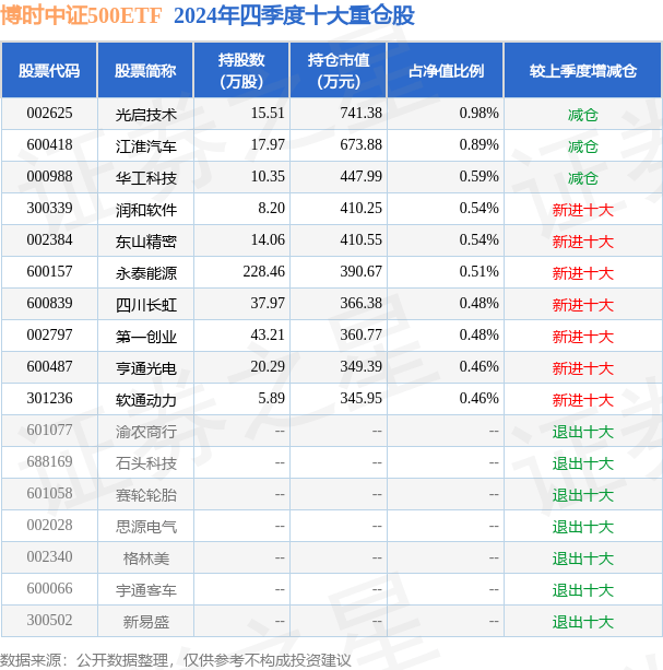 博时中证500ETF为指数型-股票基金,根据最新一期基金季报显示,该基金资产配置:股票占净值比95.02%,无债券类资产,现金占净值比4.5%。基金十大重仓股如下: