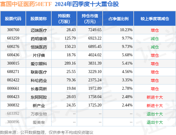 富国中证医药50ETF为指数型-股票基金,根据最新一期基金季报显示,该基金资产配置:股票占净值比99.51%,无债券类资产,现金占净值比0.58%。基金十大重仓股如下: