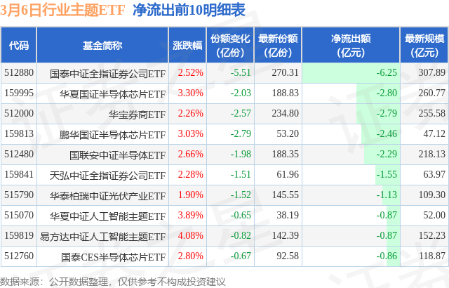 当日有202只行业主题ETF基金出现资金净流出,其中净流出排首位的是国泰中证全指证券公司ETF(512880),份额减少了5.51亿份,净流出额为6.25亿元。