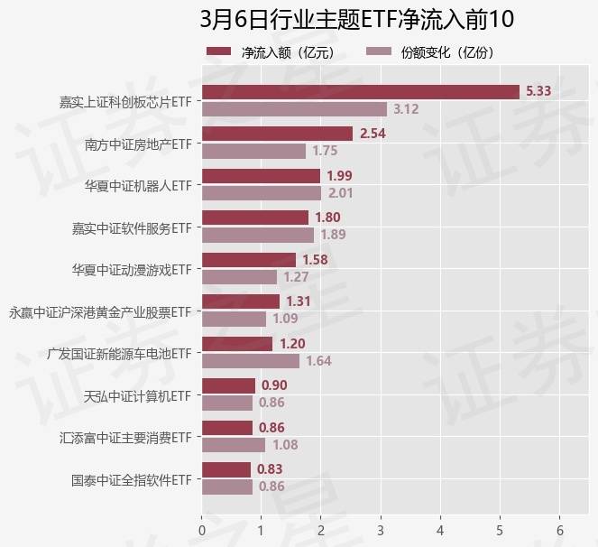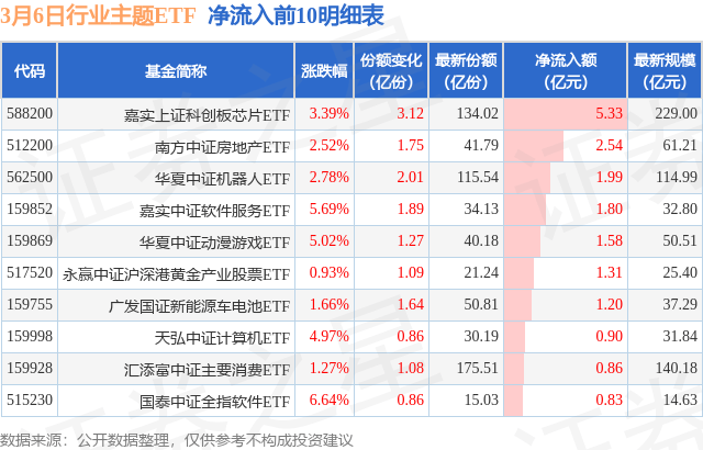 当日有110只行业主题ETF基金出现资金净流入,其中净流入排首位的是嘉实上证科创板芯片ETF(588200),份额增加了3.12亿份,净流入额为5.33亿元。